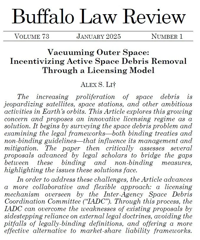 I am excited to share that my sixth space law article is now published in the Buffalo Law Review! The piece is available here: “Vacuuming Outer Space: Incentivizing Active Space Debris Removal Through a Licensing Model”